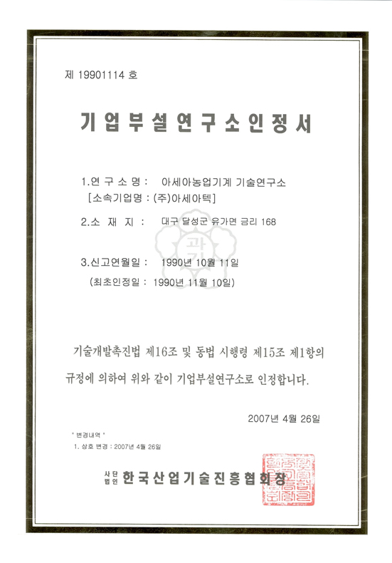 Company-affiliated research institute certificate